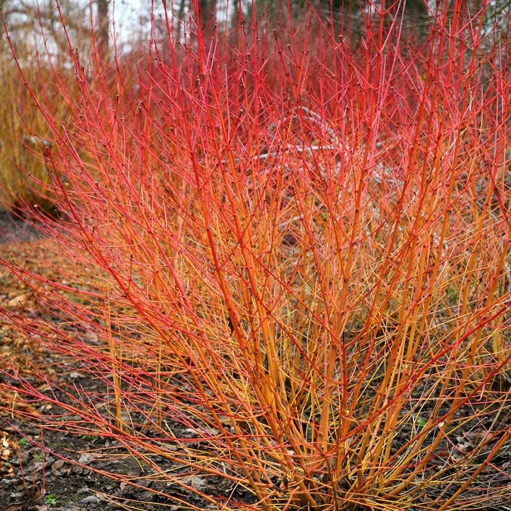 The green leaves of this upright, deciduous shrub turn bright shades of orange-yellow in autumn, before they fall to reveal spectacular orange, red and yellow bare stems. Position in full sun for best colour.