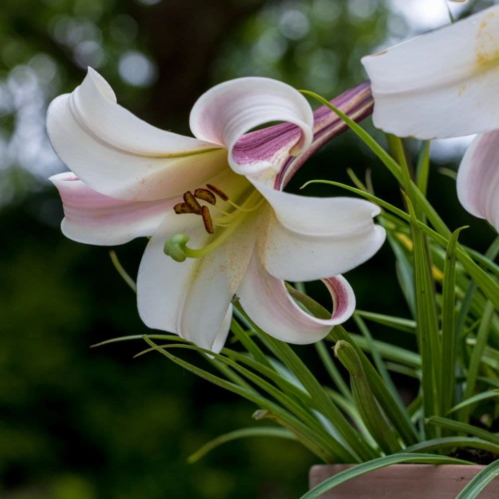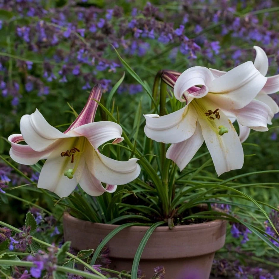 An elegant addition to the patio or border, the large trumpet-shaped flowers of this compact, species lily have a strong and delicious perfume – so for best effect try to plant it near a seating area, open window or pathway. Appearing singly, or sometimes in small clusters, the pink-flushed white flowers are also ideal for cutting, and will usually last well in the vase.